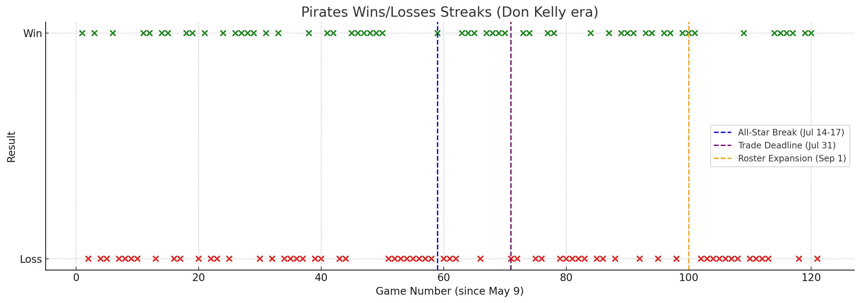This is a really strange pattern to observe that the team would lose more than 4 games in a row and only win one during these stretches. Why not win two games during these long ranges of losing? Why lose at least 4 during these time ranges? Outside these time ranges under Kelly the Bucs never lost more than two in a row. How can that be? It is so weird. Stranger yet the biggest of these losing streaks happened around the two biggest events during the MLB season. One being the all-star break and draft, and the other being during September callups when the Bucs successfully clinched the third-best overall odds to win the 1st overall pick in next year's draft.